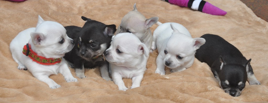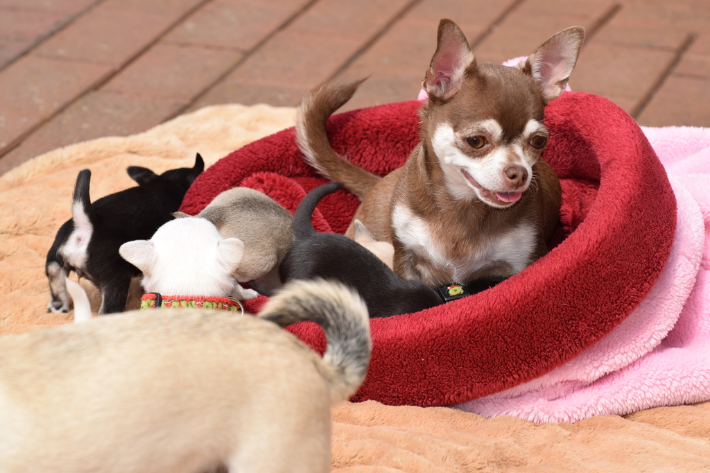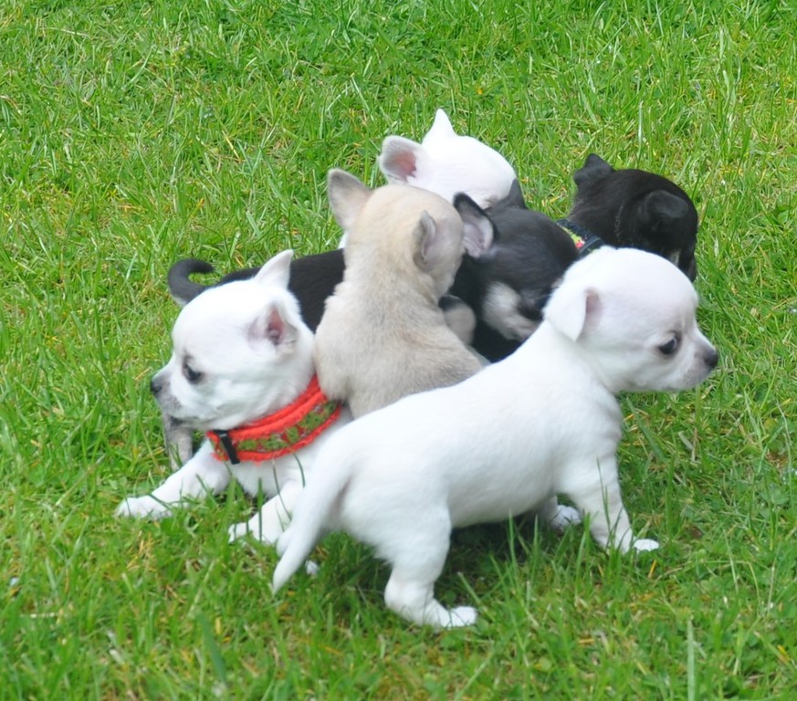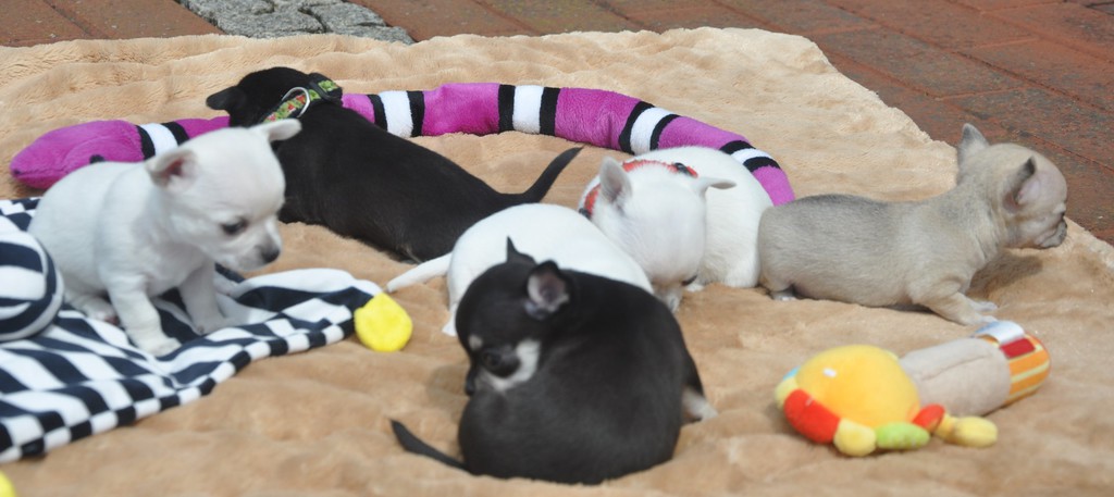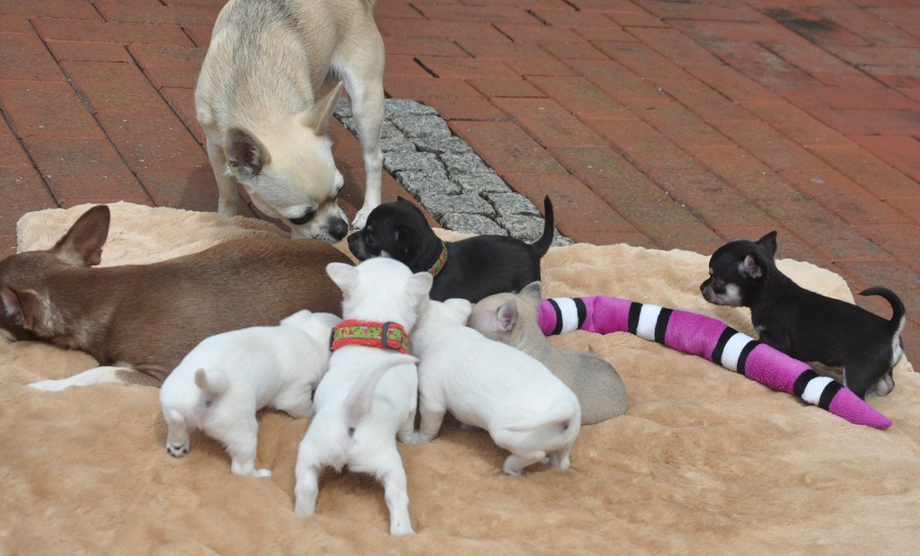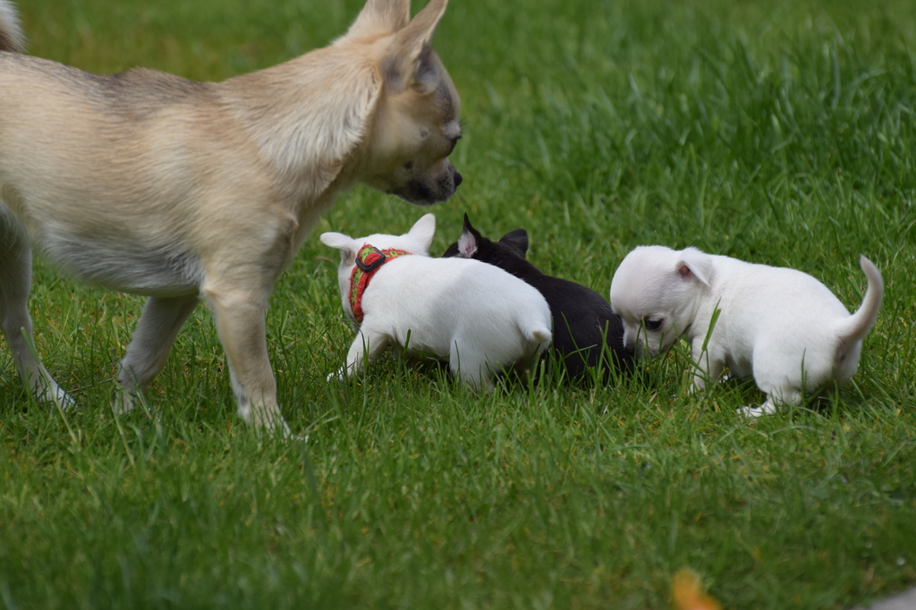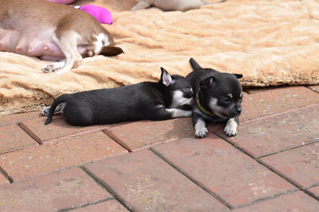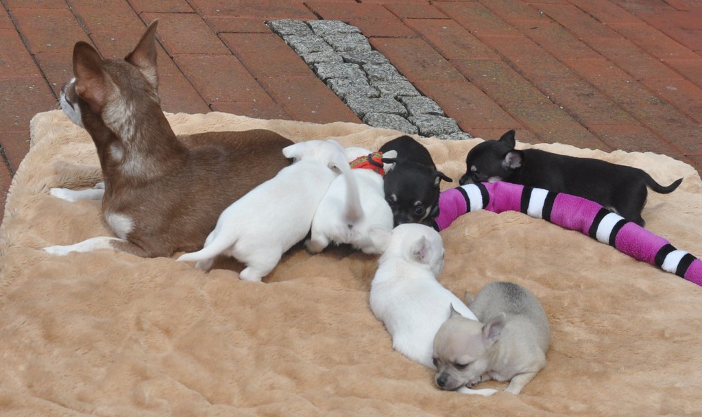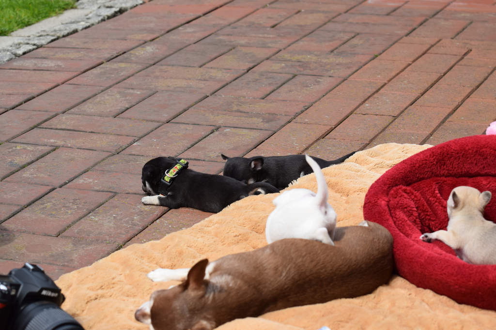 Alle Welpen fressen Mittlerweile selbstverständlich alleine und bekommen nur noch kleine Zwischenmahlzeiten von Mama. Alle Erkunden mutig, neugierig Ihre neue Welt außerhalb des Welpenauslaufs und lernen täglich was neues dazu.