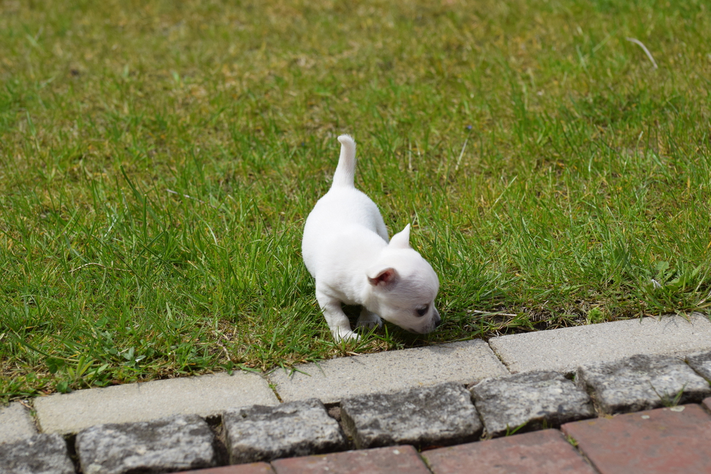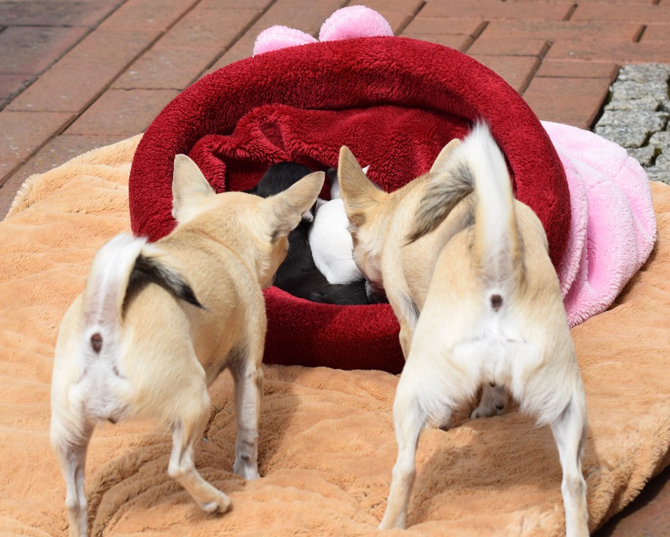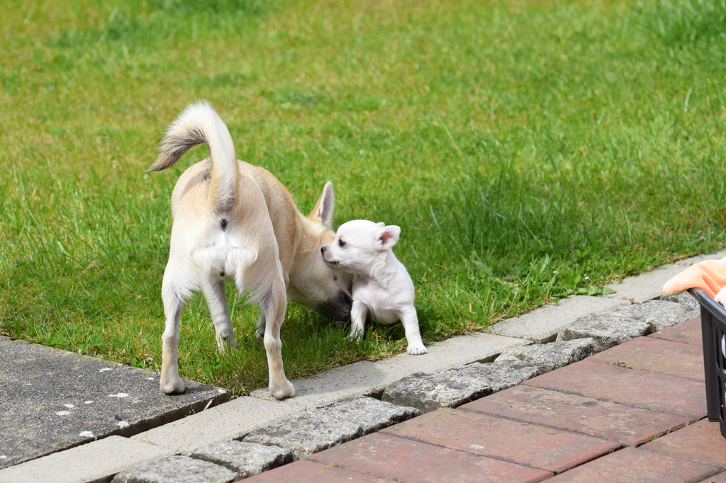 Heute Mittag bei strahlendem Sonnenschein konnten die Welpen mit knapp 5 Wochen das erste Mal nach draußen in den Garten.
