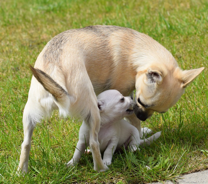 Mutter und Welpen geht es nach der Anstrengungen Geburt gut.
